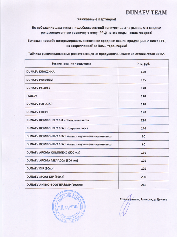Иваныч Опубликовано 6 апреля, 2016 Опубликовано 6 апреля, 2016 Вот по этому вопросу,товарищ продаёт по мелкооптовым ценам: Условия покупки продукции Dunaev через Кусмарцева Максима http://fadeevfishing...unaev”/?p=79350 Узнал цены у Максима,теперь надо думать где заказывать если что.Прайс на прикормку и арома от Дунаев : https://cloud.mail.r.../6Y3v/ej78F6rcX Нужно купить минимум 40 позиций прикормки ( допустим 2 коробки по 20 пачкек). При этом количество прикормки одного вида должно быть кратно 10 пачкам. Аромы, мелассы, дипы , копру можно заказывать поштучно, хоть по 1 шт. одного вида. Отправка - ТК Деловые Линии или другими ТК, оплата за достаквку транспортной по факту получения заказа вами , за прикормку - переводом на мою карту сбербанка. Многие интересуются стоимостью доставки. Она зависит от объема, веса груза и дальности перевозки. Могу сказать, что по факту работы доставка "накидывает" сверху на каждую пачку прикормки 6-10 руб. Минимальные розничные цены установленные на 2016 год. Думаю у нас цены будут в разы больше,хотя вот что пишет сам Александр Дунаев.