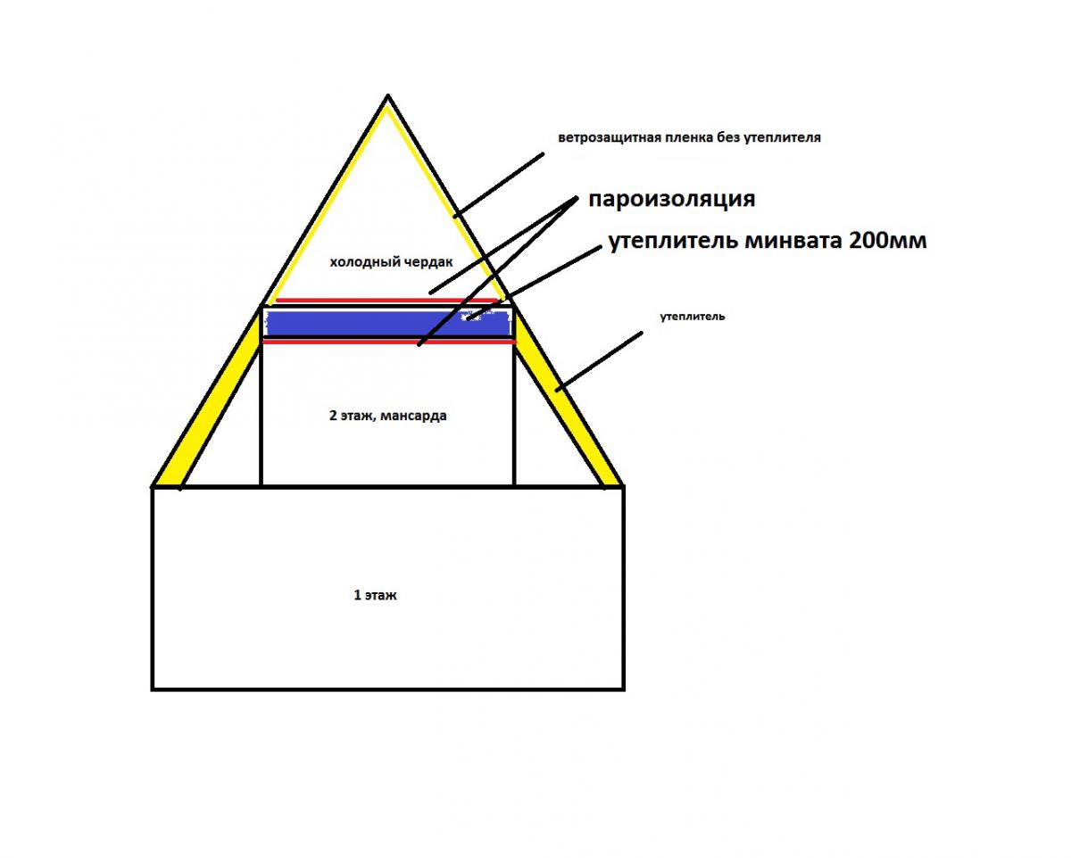 SerGa Опубликовано 17 января, 2017 Опубликовано 17 января, 2017 Скопирую свой вопрос с форумхауса, потому что мне важно мнение каждого спеца. Там мне уже сказали, что пароизоляция со стороны чердака была лишней, но может еще кто что добавит? Необходимо продолжать отделку а из за капающих потолков этого делать не стоит. Имеется одноэтажный жилой дом, с утепленной мансардой (пока не жилой) и холодным чердаком. До середины декабря на утепленной мансарде не было отопления, морозы иногда доходили до минус 35. Затем, когда стало теплее, закончили и запустили на минимум систему отопления, температура на мансарде стала +10...+18, в зависимости от погоды. После включения отопления побежал конденсат с потолка, который этим летом я летом утеплил так: 1. Пароизоляция со стороны мансарды. 2. Черновой потолок. 3. Минвата в 4 слоя = 20см. 4. Пароизоляция со стороны холодного чердака. Сейчас на потолке временами появляются пузыри с водой на пленке, которые приходится протыкать ножом и сливать воду, местами, где бежало особо сильно, пленку снял полностью, чтобы сох потолок. Сама пленка положена правильной стороной, внахлест, но стыки к сожалению ни один не проклеил. Залез на холодный чердак, проверил, минвата стала вся сырая, как кисель, пароизоляция со стороны ваты покрылась ледяной коркой. Подскажите, ошибка в том, что не проклеил стыки? Или поздно запустил отопление? Или вместо пароизоляции со стороны холодного чердака, нужно было положить ветрозащитную пленку (именно так показывает отсутствие росы калькулятор расчета точки росы )? Картинка