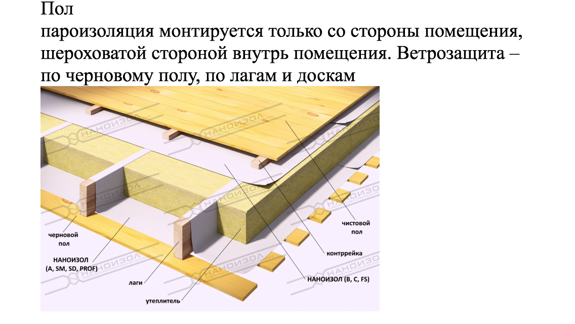 Leo.n Опубликовано 1 октября, 2018 Опубликовано 1 октября, 2018 Спасибо за ответы. Пол по грунту не получится, часть1 этажа - гараж, там земля близко, остальная часть - под жилое - там нужен доступ под пол - трубы. Лаги смонтированы. Наверно положить на землю армированный полиэтилен? Относительно того, что ветрозащита делается под черновой пол - сайт производителя Наноизол - фото вставляю. Не сам придумал. Вопросик, что в линейке Наноизол называем мембраной? Что-бы мне не ошибиться. А по межэтажному перекрытию - вообще без пленок? Ваты в пол хочу 150, лаги 180