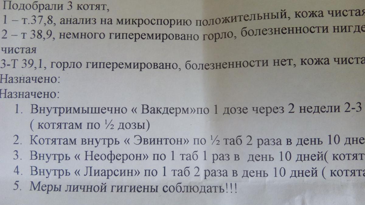 Нет Опубликовано 25 октября, 2015 Автор Опубликовано 25 октября, 2015 (изменено) Привейте всех от лишая-вакцина используется для лечения и для профилактики. Вот совершенно согласна. Когда я думала, что моя собака лишай подхватила перерыла весь инет. И именно это там и советовали :) Мои привиты,так как постоянно кто нибудь да поступает с улицы. А малышей сначала надо пролечить наверно, но я так понимаю Вакдерм и является прививкой. Вот все назначения котятам Может у кого то остались таблетки Эвинтон, их в упаковки 50 штук, после лечения одной кошки должно много остаться. Я готова даже купить остатки за недорого. Ну и неоферон и леарсил, хоть и гомеопатия, но котишкам поддержаться надо, тоже может у кого есть. И еще, меня смущает Вакдерм, это ведь инъекции, как их до нас то везут, ведь у них ограничения по температуре хранения. Изменено 25 октября, 2015 пользователем Нет