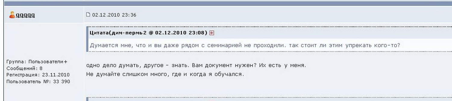 дим-пермь2 Опубликовано 8 декабря, 2010 Опубликовано 8 декабря, 2010 Дим-пермь 2 выдумал что у меня семинария, хотя я нигде не говорил об этом. Сам выдумал и меня упрекает своей выдумкой. Показать документ просит. У меня из три. Школа, технарь и академия. Какой пред''явить? Таки опять лжете. Вам нужны доказательства. так их есть у меня. смотрите внимательно на скриншот. Таки семинарию предъявите?