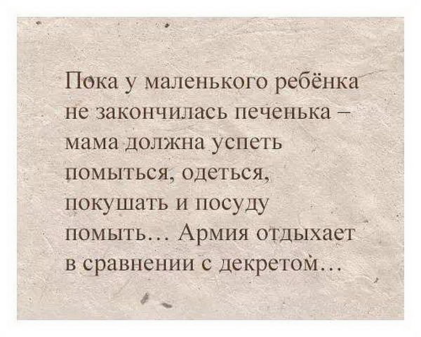Татьяна1984 Опубликовано 25 декабря, 2013 Опубликовано 25 декабря, 2013 Букафф много, но я смеялась до слез)))) Я с первым на слова акушерки" придется надрезать, очень крупный" кричала:" Тимофей втяни щеки, мы не проходим")) 36 недель. Мне 20 лет. Положили меня заранее. В то время не было столько доступной информации про беременность и роды. Сама ещё детский сад. Всю беременность угроза была. А тут ни в одном глазу. Вечером было подозрение на подтекание вод. Дали мне пелёночку, говорят: «Походи с ней, потом отправим на анализ». Время 12 часов ночи. Не спится. Пошла в туалет. И гляжу на этой пелёночке лежит что-то, похожее на червяка прозрачного с разноцветными прожилками. У меня начинается тихая истерика. Думаю – что-то у ребёночка отвалилось. Задаюсь вопросом: на что похоже? ГЛАЗ! – осенило меня. Я несусь в родзал. Дежурит замглавврача. Принимает роды. Я влетаю и ору: «Ольга Александровна, у моего ребёночка глаз вывалился!» У неё лицо так вытянулось. У роженицы схватки прекратились, акушерка роняет инструмент. Картина маслом. Она мне говорит: «Сюда иди». Я ей сую свою пелёнку. У них начинается тихая истерика: «Дурында – это пробка. Иди спать. Завтра рожать будем!» Потом весь роддом мне этот глаз ещё долго вспоминал. Я беременная на работу устроилась – месяц-два на линии на телефоне отсидела. И все! Атас! В маршрутку заходила, и говорила: «Здравствуйте, меня зовут Анна….» Маршрутка как-то неохотно со мной в ответ здоровалась. Пришла к остеопату на 7-месяце, он сначала, как полагается, все расспрашивает, записывает… На вопрос: «Какой месяц?» я долго судорожно копалась в памяти и наконец выдавила – январь… Он растерялся в свою очередь и, удерживая смех, переспросил: «Месяц беременности?» Однажды жутко захотелось курицы. Купила курицу, сварила, съела. Всю. После этого мне было не очень хорошо и всю остальную беременность я не выносила даже слова «курица». По этому случаю в семье она была переименована в «барсука». Несведущих людей очень забавляли упоминаемые в разговоре супы из барсука, жареные барсучьи окорочка, но пуще всего барсучьи яйца! На одном из приемов: «Доктор, а когда у меня дата родов?» «А тебе зачем?» Действительно, чего это я вдруг интересуюсь? Схватки были сильные, между ними еще умудрялась звонить мужу со словами: «Я тебе в еду пургена налью и закроюсь в туалете, когда будешь ломиться, а я тогда буду тебе говорить, что нельзя, терпи!». Он смеялся. Трындец наступил на следующее утро после родов – скрипя всеми конечностями, аки несмазанный терминатор, я медленно, но верно, стала продвигаться в сторону туалета. Когда сынулю вытащили из живота – сразу увидела, стало так легко и спокойно, что потянуло в сон, от усталости явно. Я говорила: «Ребята, я посплю, а вы меня зашивайте!» Анестезиолог кричал: «Не смей закрывать глаза!» Я сговорилась, что буду лежать с одним открытым глазом, а вторым спать. У меня мама рассказывала, что когда она меня рожала, то в этой же палате была женщина, которая вставала на колени перед тумбочкой, засовывала туда голову и в нее кричала. Ей так видимо легче было схватки перенести. На зашивание наркоз все таки сделали, и я будучи под наркозом улыбалась во весь рот, слышу врач говорит: «Она там мультики, что ли, смотрит?» Меня после кесарева вывозят в коридор, смотрю – муж с сыном на руках стоит – довольный такой. Подвезли к нему, остановили. 