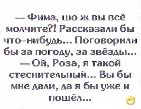 GreyBeard Опубликовано 7 октября, 2017 Опубликовано 7 октября, 2017 С чего это, Блэк, такие "душещипательные" размышления относительно моей персоны? Еще совсем недавно я в ваших глазах был "пылью на грязных ботинках". Так откуда вдруг рост моих акций на вашей бирже? А насчет "как мне тоскливо"... Здесь есть некоторые личности, которым все время скучно. Уж вызвано ли это банальной меланхолией или отсутствием внимания, мне не ведомо. Но, хотите верьте, хотите нет, я вполне самодостаточен, чтобы тосковать по кому-либо (кроме ушедших в мир иной родителей, конечно), пусть даже и наедине с самим собой... Это завёрнутое в удобоваримую обёртку желание убедить Вас отказаться от ''лёгкого'' стиля публикаций. Это - Ваше мыслеизобретение. Именно такого не было. Я всего лишь просил как-то не использовать термин ''уважаемый такой-то'', поскольку в него не верил. И не более (в целом). Да-да. Я конечно ошибся. У вас всё хорошо. Именно поэтому Вы и выложили эту..., ... мысле-извергацию-мотивацию. ************* А впрочем. Помогайте пользователям улыбаться. Это ж дело положительное. Наверное у Вас это лучше получается, чем у меня. (Микродискуссию я развернул от некоторой скуки, скорее всего. Я скучный. И склонный к скуке.)
