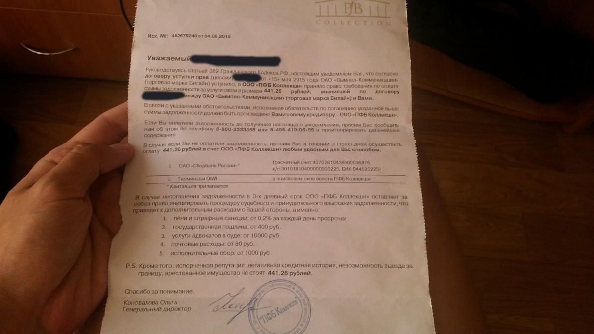 nuHrBuH :D Опубликовано 19 июня, 2015 Опубликовано 19 июня, 2015 Добрый день. Помнится когда-то я уже обращался сюда с подобной проблемой. Второй раз за год приходит письмо вот с таким содержанием (фото). Я сходил в Билайн, узнал откуда этот долг вообще взялся. Они мне сообщили, что симкарта была оформлена на меня 17 июня 2013 года, паспортные данные полностью совпали, и на ней висел долг. Сама симкарта уже закрыта. По просьбе предоставить мне распечатку когда была открыта и закрыта симкарта, когда и какие списания были произведены с неё, мне отказали под предлогом, что такую информацию можно получить только через полицию. По факту же я с Билайном никаких договоров не заключал. Что делать то? К адвокатам идти денег нет...