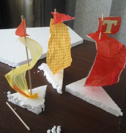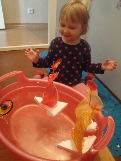 Ласка Опубликовано 25 августа, 2015 Автор Опубликовано 25 августа, 2015 Ещё идея. Пришёл стульчик, в упаковке пенопласт плоский, папа хотел выбросить (как всегда), отвоевали, припрятали... Вот, из пакетов, шпажек и пенопласта. Флагман флотилии - ботик "Тася". Налили в бухту тёплой воды и вперёд. Адмиральша сама вставляла шпажки, потом сбегала за "бибами" (рыбами). В итоге устроился шторм
