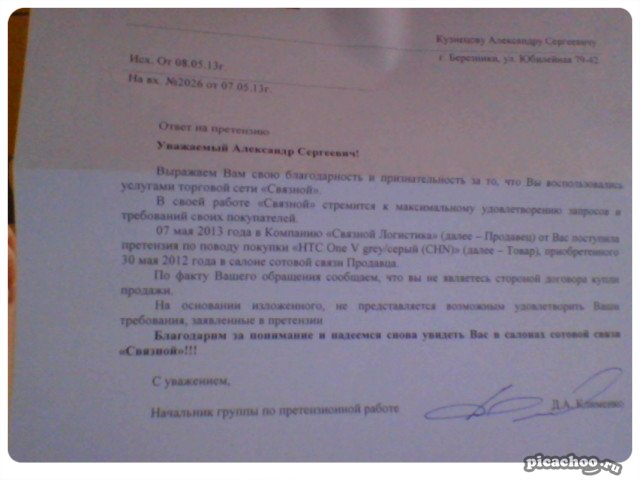 nuHrBuH :D Опубликовано 21 мая, 2013 Опубликовано 21 мая, 2013 Сегодня пришёл письменный ответ на претензию от "Связного". Если я не ошибаюсь, то ответили они точно в срок. И этот ответ ни***** меня не обрадовал!