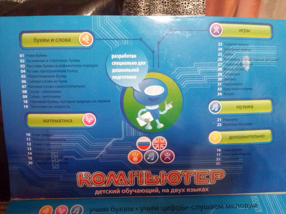юльчик82-08 Опубликовано 14 декабря, 2015 Опубликовано 14 декабря, 2015 Обучающий компьютер, 35 функций Обучающий компьютер создан специально для дошкольной подготовки детей и подойдет для ребят от трех лет. Пластиковый компьютер своим внешним видом напоминает настоящий ноутбук с мышкой в комплекте. С помощью этого компьютера вы сможете изучить слова на двух языках (русский и английский), ведь детский ноутбук включает в себя 35 функций, 11 интересных логических игр, а также 30 мелодий для веселого отдыха в перерывах между обучением. В идеальном состоянии, пользовались несколько раз. Цена 1100 руб.89194721731