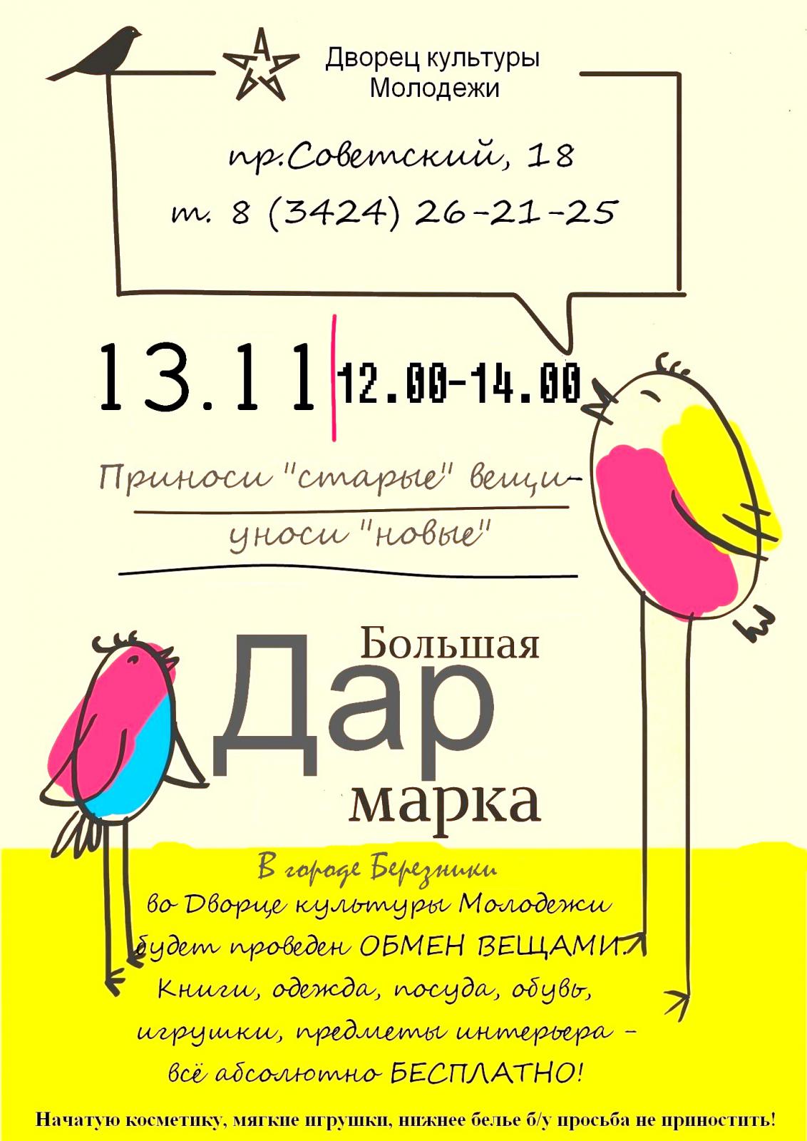 Дворец Молодежи Опубликовано 9 ноября, 2016 Автор Опубликовано 9 ноября, 2016 И вновь приглашаем на полюбившуюся Дармарку! 13.11.2016 с 12 до 14 Дворец культуры Молодежи, проспект Советский, 18