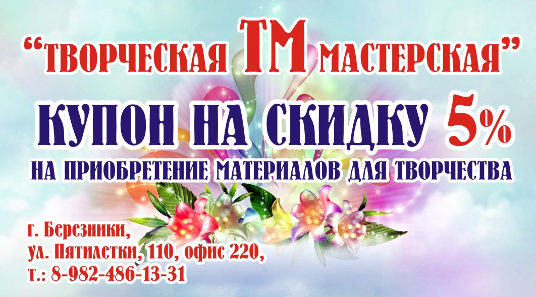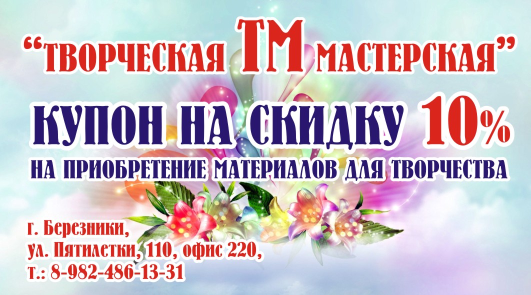 Творческая Мастерская Опубликовано 5 апреля, 2016 Опубликовано 5 апреля, 2016 Добрый день, наконец-то я нашла пароль от берфорума и открою свою темку тут! Меня зовут Мария! Моя мастерская находится в г. Березники, Пятилетки 110, офис 220 Рукодельницы нашего города могут найти там очень много, много всего интересного для себя вот моя группа в контакте с материалами https://vk.com/materialtm Также всех желающих я приглашаю к нам на различные Мастер-Классы, расписание тут https://vk.com/topic...273132_33676019 более подробную информацию о мастер-классах смотрите в моей группе в контакте https://vk.com/mk_tmber 9 апреля в 12-00 - Мастер-Класс - Обратный декупаж стеклянной поверхности (Декорирование стеклянной тарелки) 10 апреля в 12-00 - Мастер-Класс - Фантазийный цветок из фоамирана (2 уровень)