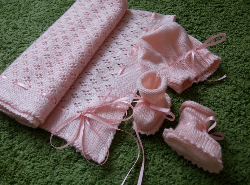 svetos Опубликовано 16 апреля, 2016 Опубликовано 16 апреля, 2016 (новый)Комлект для новорожденной девочки выполнен из пряжи Alise bebe акрил. Состоит из пледа 80/80,пинеток. шапочки. вяжу на заказ
