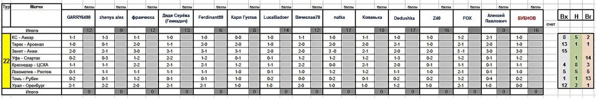 и да, в силу малой ширины столбца и многочисленными исправлениями в 19 туре я не заметила, что мы всё же победили Бубнова, как и анонсировалось ранее...и тогда счёт 11-10 в пользу берфорума!!!!