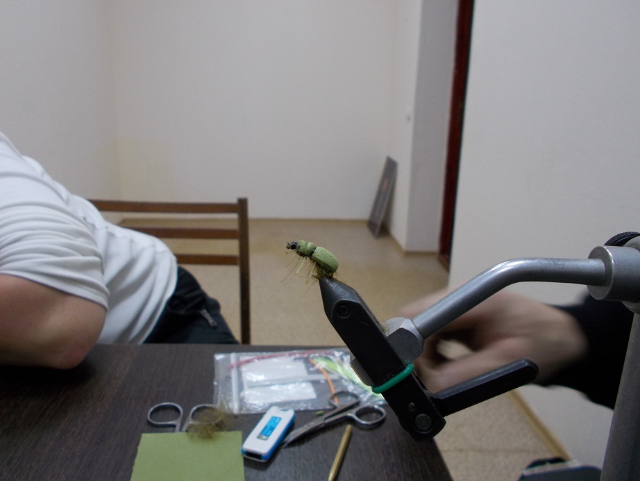 Студентт Опубликовано 31 декабря, 2013 Опубликовано 31 декабря, 2013 .Александр,а для прогульщиков легенду жука можно,если не трудно. ну как обещал: крючок - №12 В401 монтажная нить - зелёная 8/0 уни ножки - резинка бисероплетения Гамма. тело даббинг - olive (не помню што за шерсть была волосатая така) крылья крыша - пенка - 1,5 мм Шаг 1 - закрепляем ноги: шаг 2 - обрезаем пенку на конус, привязываем, делаем даббинговую петлю и с даббингом наматываем тело: при этом аккуратненько обходим ножки чтобы не примотать и не сделать жука калекой. шаг 3 - пригибаем, и с небольшим натягом держим пенку. Фиксируем её монтажкой. Сначала с небольшим натяжением(чтобы не перерезать) затем сильнее.. шаг 4 - фиксируем второй раз и обрезаем пенку, остатки - приматываем. шаг 5 на большом сегменте спины делаем продольный разрез - имитация разделения крыльев. красим маркером, покрываем лаком головку и пенку - пусть блестят как у кота..... А блин, чуть не забыл - ножки гнуть - типа коленца ног изображать, нужно нагретым пинцетом(не сильно нагретым, чтоб не отжечь нафиг) либо как я сделал - поднёс рядом выжигатель по дереву и согнул после нагрева. Хух :cu: вот вроде как то так.