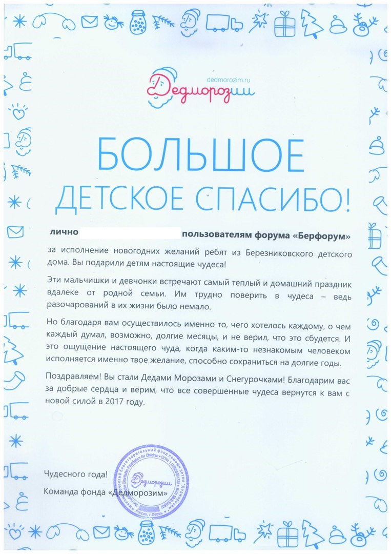 Ласка Опубликовано 29 января, 2017 Автор Опубликовано 29 января, 2017 Светлана, добрый день! Получила Большое Спасибо Оригинал у меня, есть повод еще раз встретиться) , а скан отправляю, разместите его на берфоруме. Еще раз Спасибо вашей замечательной команде из Березников! В феврале поеду в Березники поздравлять именинников и подарки новогодние вручить тем, кто в больницах был. Можете присоединяться с девочками. С датой пока не определилась: 4 или 11 февраля . Ловите, Большое детское СПАСИБО)))