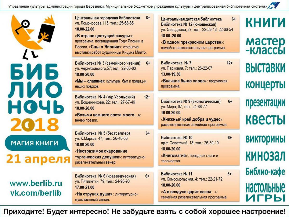 Надежда Юрьевна Опубликовано 19 апреля, 2018 Автор Опубликовано 19 апреля, 2018 3] БИБЛИОНОЧЬ-2018 для больших и маленьких! 21 апреля 2018 года все библиотеки г. Березники примут участие в ежегодной всероссийской акции поддержки чтения «Библионочь». Тема «Библионочи» в 2018 году – «Магия книги». Полную Программу мероприятий каждой библиотеки смотрите на официальном сайте МБУК "СБС". На 10 площадках муниципальных библиотек города состоятся интересные культурно-досуговые и познавательные программы, главными героями которых станут книги, старинные и новые, детские и взрослые, книги стихов, путешествий, сказок, и люди, которые читают и увлекают за собой в мир творчества, знаний, открытий. Библиотеки проведут поэтические чтения и мастер-классы, литературные инсценировки и викторины, тематические лекции и музыкальные концерты, конкурс эскизов и турнир по судоку, познакомят с тайнами старых книг, удивят необычными книгами и раскроются как территории творчества и интеллектуального отдыха. Вход свободный! 6+ #библионочь #Березники_библиотека