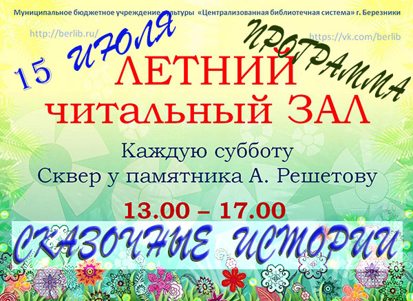 Надежда Юрьевна Опубликовано 26 июля, 2017 Автор Опубликовано 26 июля, 2017 Программа мероприятия: Мастер-классы 13.00 – 15.00 Бумажное моделирование с художником Светланой Ефимовой. 14.00 – 16.00 Весёлое рисование в технике граттаж. Интеллектуальная площадка 13.00 – 15.00 Сеанс одновременной игры проводит мастер международного класса, мастер спорта России Светлана Ершова. «Детское время». Лужайка-Почитайка собирает книголюбов 14.00 – 16.00 Читаем и слушаем сказку-юбиляр Братьев Гримм «Белоснежка» с Анастасией Юшковой. Литературная викторина. Собираем пазлы. Рисуем сказочных героев. Отдыхаем с настольными играми. Читаем детские журналы. Литературно-музыкальная площадка. 16.00 – 17.00 Березниковские музыканты приглашают в пространство песни Для вас: Свободный книгообмен. Журнальный зал для всей семьи. «Лужайка-почитайка» для детей. Виртуальный стеллаж «ЛитРес». ВХОД И УЧАСТИЕ – СВОБОДНОЕ! Организатор: МБУК «ЦБС» г. Березники (ул. Ломоносова, 115). Телефон для справок: 25-68-85 До встречи следующим летом! http://berlib.ru Много фото с Летних читальных залов - игры, мастер-классы, музыкальные выступления, чтение книг и журналов