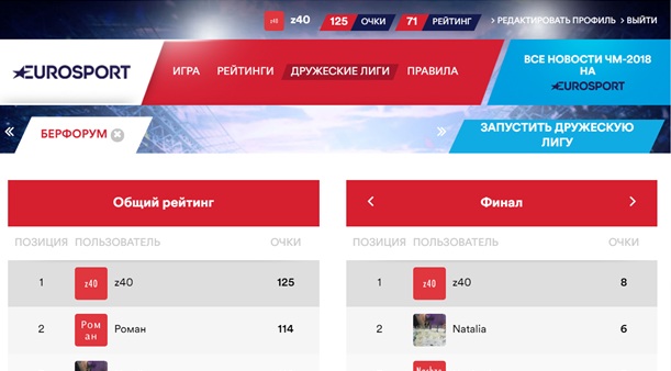 Hruk Опубликовано 16 июля, 2018 Опубликовано 16 июля, 2018 Всем спасибо за борьбу!) Не за горами евро, надеюсь еще посоревнуемся) PS. За угадывание победителя в плоффе нужно бы тоже что-то начислять. Но это не точно.