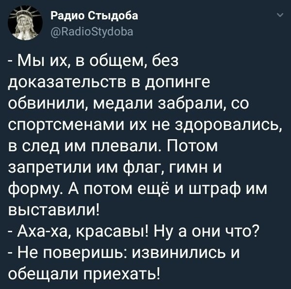 Народ, хватит бурлить. Участие России в ОИ просрали конкретные люди - Гарант, Министр спорта, СФ, ГД. Не спортсмены, а они. Эти сраные депутаты ГД щас во всех шоу орут громче всех, как нас нагнули, подзуживают людей. Хотя своими прямыми обязанностями - защитой интересов страны, эти дебилы тогда, когда надо было заниматься, нихрена не занимались.