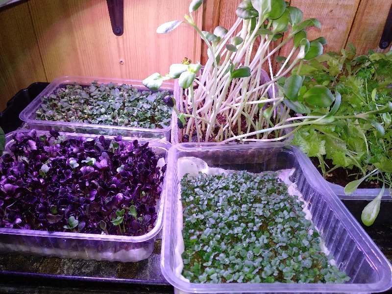 Д. Руми Опубликовано 19 ноября, 2019 Автор Опубликовано 19 ноября, 2019 Реанимирует тему. Какими глупостями я занимался триста лет тому назад... Технологии выращивания микрозелени давно отлажены в мелкопромышленных масштабах, их несколько. И всё не так просто, как казалось поначалу. У каждой культуры свои нюансы. А этих культур сейчас уже десятки. После пары месяцев тренировок и у меня стало что-то получаться. Если кому интересно, поделюсь рецептом, как вырастить самую простую и быструю микрозелень. На фото редис Санго, простой редис, руккола, недоеденный переросший подсолнух и салатная смесь бэби лиф.