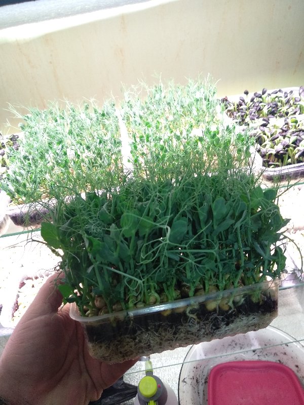 Д. Руми Опубликовано 3 декабря, 2019 Автор Опубликовано 3 декабря, 2019 А пока нет гороха, потренируйтесь на маше и нуте. Их полно на рынке. Их ростки не такие нежные, но тоже интересные. Технология та же. Нут мы использовали в зелёные щи. Причем сняли с лотка 3 урожая, после срезки он отлично отрастает снова, если не срезать под самый корешок и чуть подкармливать. Горошек, кстати, тоже.