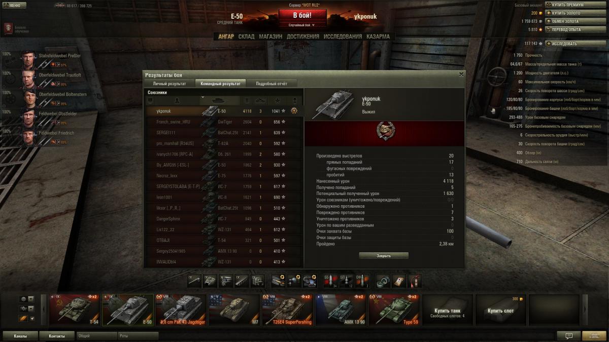 Stinger13 Опубликовано 20 марта, 2013 Опубликовано 20 марта, 2013 В нашем клане люди только из Березников. Набираем потихоньку, никуда особо не стремимся, катаем взводами в свое удовольствие. http://worldoftanks.ru/community/accounts/923738-ykponuk/ Не хотите с нами объединиться? Клан конечно не березниковский, но все люди взрослые, адекватные. Никакой обязаловки, просто отдыхаем после работы, катая во взводах. http://worldoftanks.ru/community/clans/207-ANGER/ Ех... мне до вас еще как до.... )) в ангаре пока ток 4 танка) остальное продал по неостарожности))) Катаюсь на т44 ... хочу 62а Есть хелькат... денег на т25.2 не как накопить не могу Су 8 есть.... до 14 еще 30копыта и куча серебра)) начал качать тяжа у французов... хочу амх 50/100 Не хочешь к нам в клан? Стою перед выбором что купить из 10-х СТ, открыл амера, немца, и нашего. Склоняюсь пока к Е-50М. Больше серебра нет, да и на этого еще 1,5 ляма набрать надо. Бат уже давно в ангаре, только что 6800 урона в бою нанес,по-моему личный рекорд, больше чет не припомню.. Есть Т-62а, Е-50м и батчат. 62ка больше всего понравилась. Да, точность у е-50м конечно офигенная, но это такой сарай. Да и на СТ она особо не тянет, динамика и габариты не те. P.S. Паттон 3 тоже на подходе, 15к осталось всего. Интересно, насколько понравится по сравнению с другими СТ-10. Был еще сегодня Т25/2 и я его продал :) А я хочу докачаться до прототипа и продать 25/2. При переработке ветки американцев Т30 дали, Т110Е4 открыл, а вот промежуточные позиции у меня были не открыты, приходится заполнять.