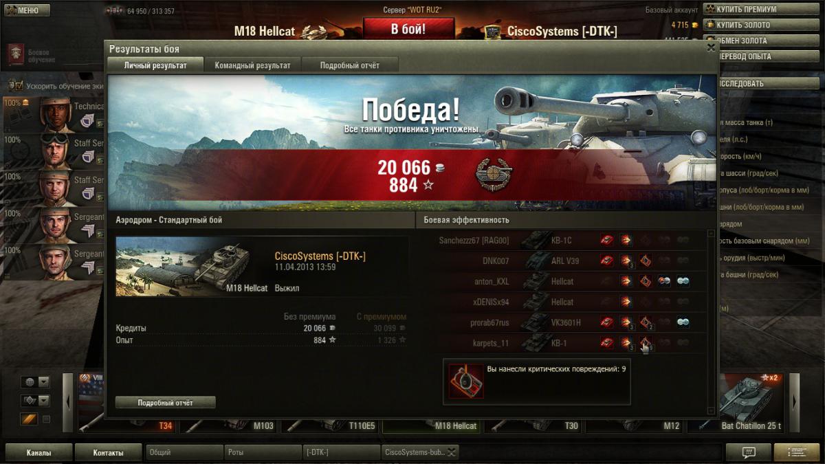 gazmaster Опубликовано 11 апреля, 2013 Опубликовано 11 апреля, 2013 Поджег. Я на Т-71 как-то тремя выстрелами набрал 1700 урона :lol: Просто выехал Т-62А и я его поджег, было тоже 9 критических повреждений и 1200 с чем-то урона у него. Странно, что не берут некоторые топовые ремкомплекты всякие. нет, это понятно что поджег, просто там как бэ модулей: ствол-гусли-рация-двигло-бак-башня-боеуклад-наблюдение всего 8, если тока починил что-то одно успел