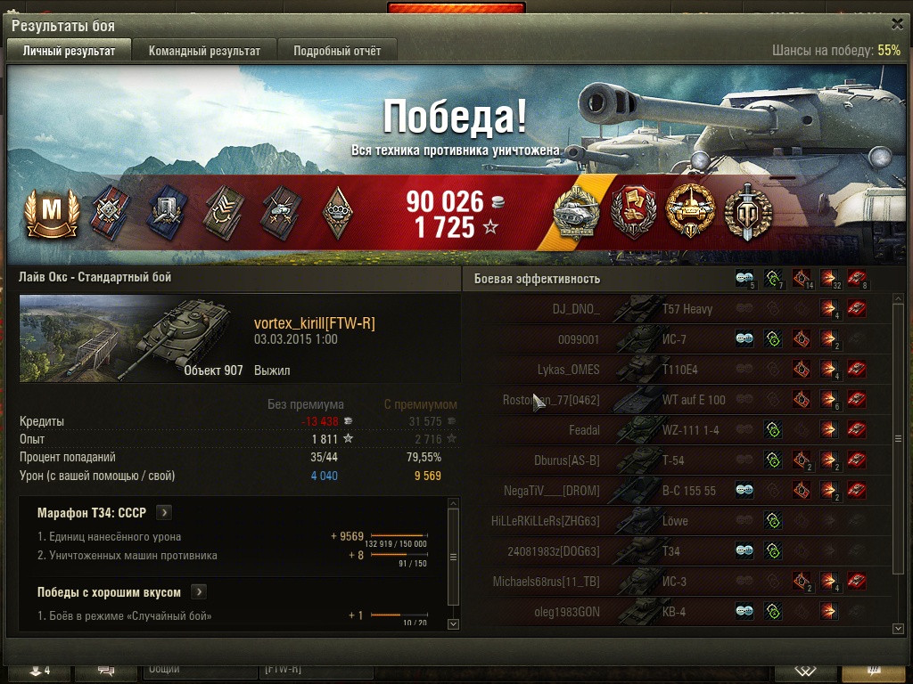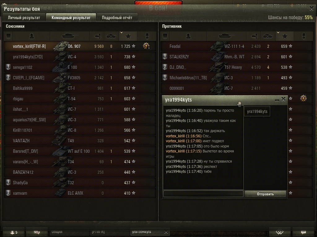 gazmaster Опубликовано 3 марта, 2015 Опубликовано 3 марта, 2015 Как то так... В середине боя инет вылетел... (спасибо РТК)... Успел войти живой) Доиграл... ПОблагодарили)) интересно было бы реплей глянуть