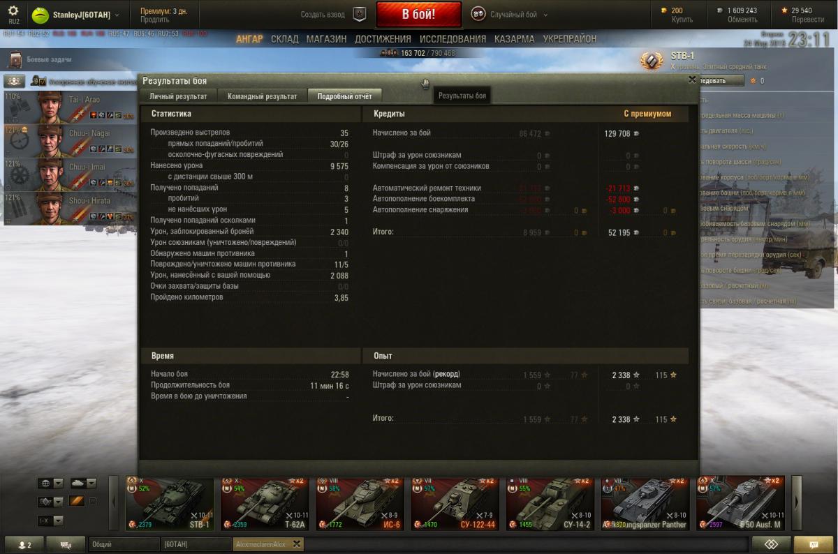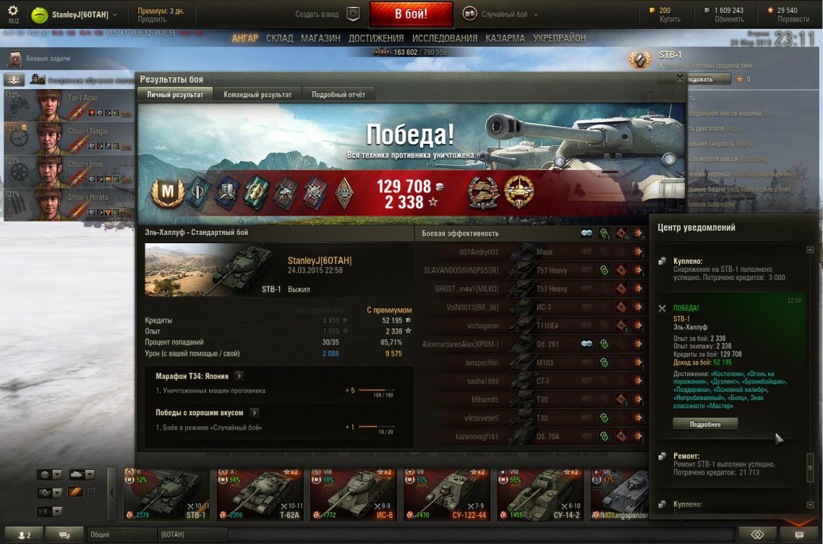 Stan Опубликовано 24 марта, 2015 Опубликовано 24 марта, 2015 Очень удачный бой ПОБЕДА! STB-1 Эль-Халлуф Опыт за бой: 2 338 Опыт экипажу: 2 338 Кредиты за бой: 129 708 Доход за бой: 52 195 Достижения: «Костолом», «Огонь на поражение», «Дуэлянт», «Бронебойщик», «Поддержка», «Основной калибр», «Непробиваемый», «Боец», Знак классности «Мастер»