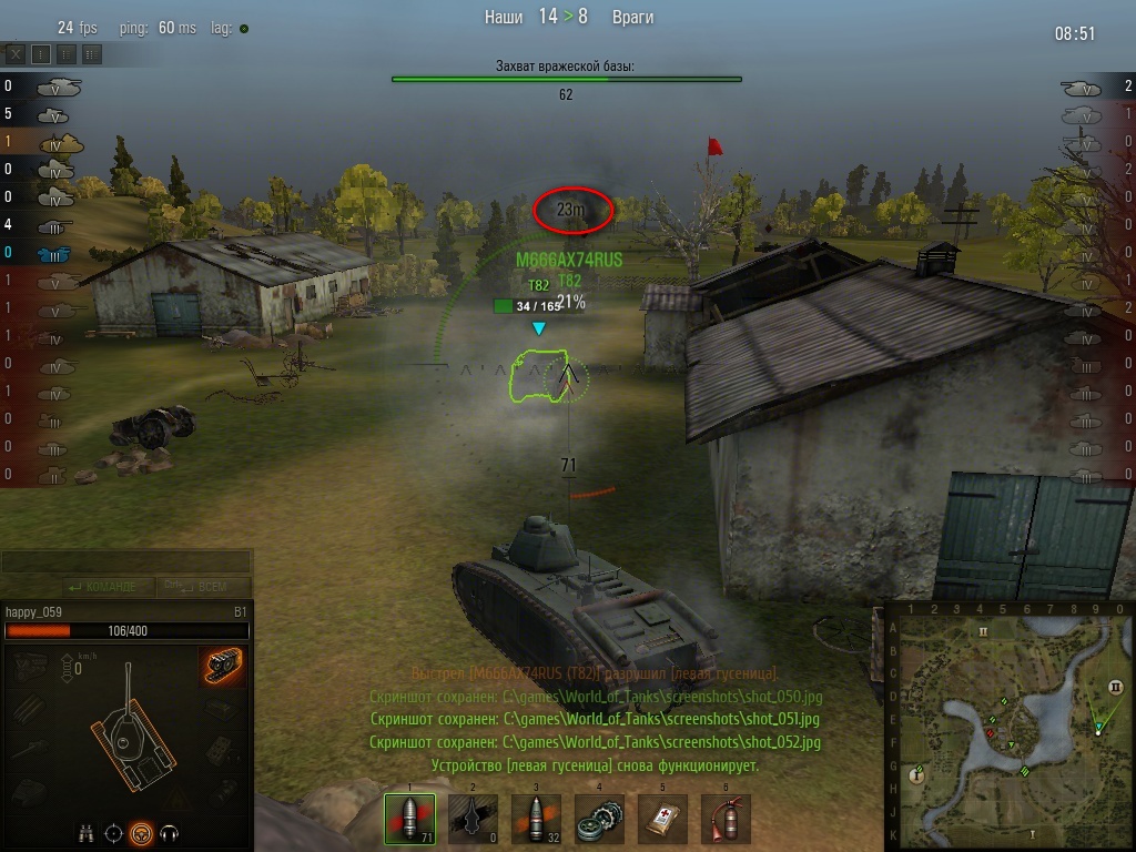 Гость carp Опубликовано 18 февраля, 2012 Опубликовано 18 февраля, 2012 вот, смотри наглядно! маленький зелёненький - это прицел моего компа, а рядом с ним синее перекрестие - это серверный. видишь как он отличается от моего. если-бы я сейчас выстрелил, то снаряд пошёл-бы по синему крестику, а не по моему прицелу. Пинг до сервера никто не отменял, так что серверный прицел "не панацея" нууу, пусть не панацея... но по любому лучше, чем вообще стреляние наугад. у меня пинг в районе 30-40 крутится, так что мне он не страшен.