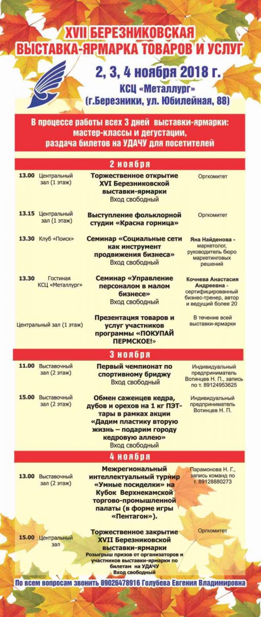 FOX Опубликовано 31 октября, 2018 Опубликовано 31 октября, 2018 Приглашаем на очередную 17 Березниковская выставка-ярмарка товаров и услуг. 2, 3 и 4 ноября 2018г.Адрес: г. Березники, ул. Юбилейная, 88 (ДК Металлургов) По вопросам участия звонить Евгении Владимировне т. 89026478916 (осталось несколько мест в центральном зале ДК. Улица, фойе, вестибюль, выставочный зал - всё полностью занято!!! Первый открытый чемпионат по спортивному БРИДЖУ в 11.00 , 3 ноября 2018 г в КСЦ "Металлург" 1 этаж, вестибюль. Всем желающим принять участие в игре записываться предварительно у индивидуального предпринимателя Николай Вотинцев по т. 89124953625. Победителю турнира - ПРИЗ от Верхнекамская торгово-промышленная палата 2 Интеллектуальный турнир на Кубок Верхнекамской торгово-промышленной палаты. Приглашаем команды к участию в интеллектуально турнире!!! Запись через личную почту https://vk.com/id14570005 группы или по телефону 89128880273 Парамонова Наталья, команда - 6 человек. 3 ноября меняем саженцы кедра, дуба и орешника на ПЭТ-тару!!! По многочисленным просьбам Березниковский муниципальный фонд поддержки и развития предпринимательства предоставляет предпринимателям возможность: очно, бесплатно пройти обучение. Записываемся на два супер-семинара в рамках деловой программы 17 Березниковской выставки ярмарки товаров и услуг.2 ноября в 13.30"Социальные сети как инструмент продвижения бизнеса" Адрес: г. Березники, ул. Юбилейная, 88 (ДК Металлургов), кафе "Глория" Спикер: Яна Найденова Маркетолог, руководитель бюро маркетинговых решений "ClientMarket" «Управление персоналом в малом бизнесе» Адрес: г. Березники, ул. Юбилейная, 88 (ДК Металлургов), бизнес-класс Спикер: Кочнева Анастасия Андреевна сертифицированный бизнес-тренер, автор и ведущий более 20 программ Семинар интересен и полезен собственникам и руководителям малого и среднего бизнеса, специалистам различных категорий, особенно отвечающих за развитие бизнеса. Запись ОБЯЗАТЕЛЬНА! по телефону 26-25-61, 89129832896, Елена Игоревна, , либо на адрес vktpp@yandex.ru Указать ФИО участника, организацию, номер телефона.