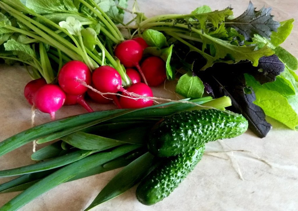 Pronezka Опубликовано 24 мая, 2019 Опубликовано 24 мая, 2019 Весенний натюрморт Редис «АлешкаF1», капуста «Мизуни», салат, лук, пёрышки чеснока, огурчики «Кураж». Огурцы посажены в большой короб (по принципу деревенского рассадника) высота 70 см. Посеяны в начале апреля дома и высажены в начале мае. томатик "Талисман" И немного красоты....куда же без неё