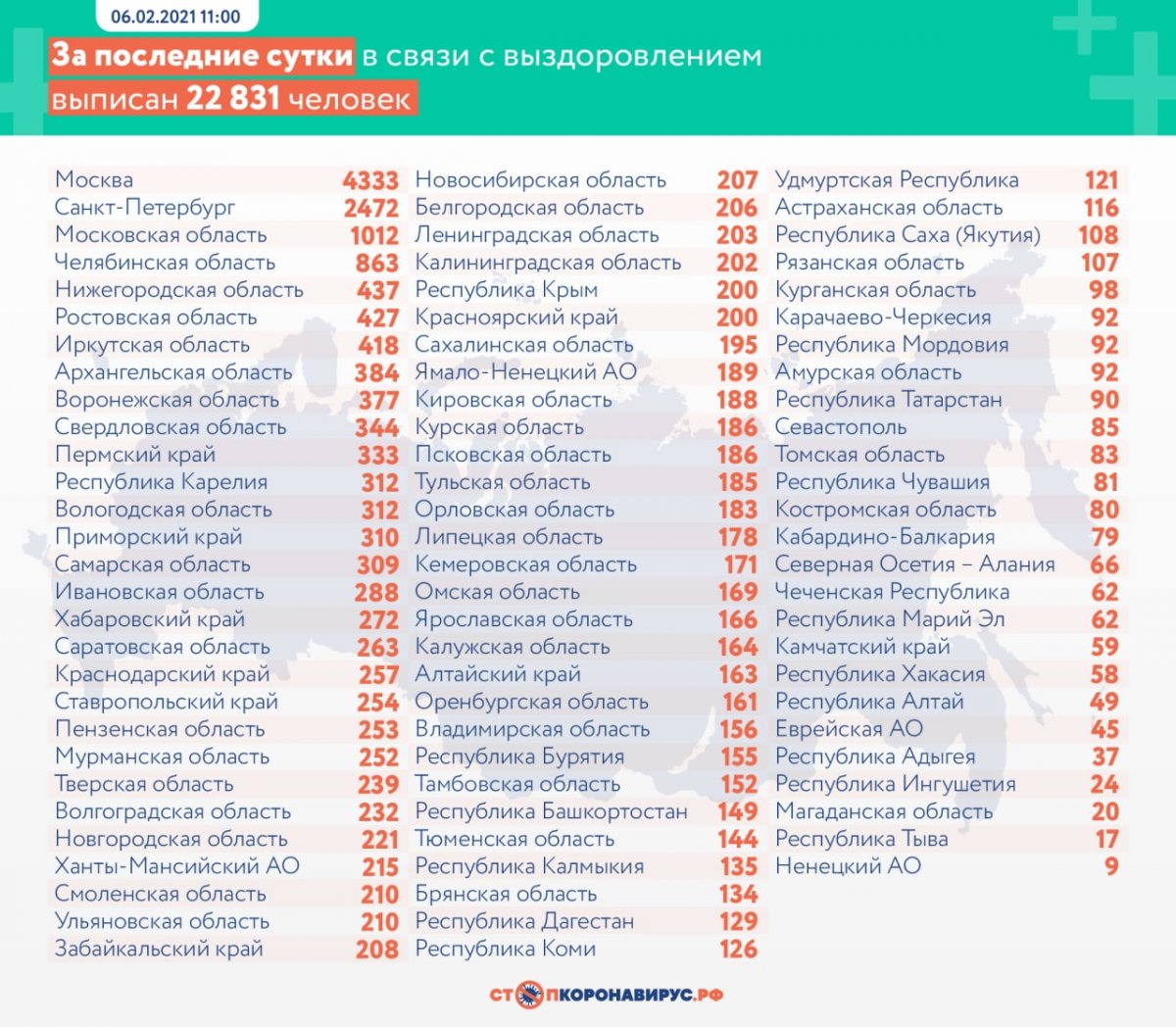 За последние сутки в России в связи с выздоровлением от коронавирусной инфекции выписан 22 831 человек.