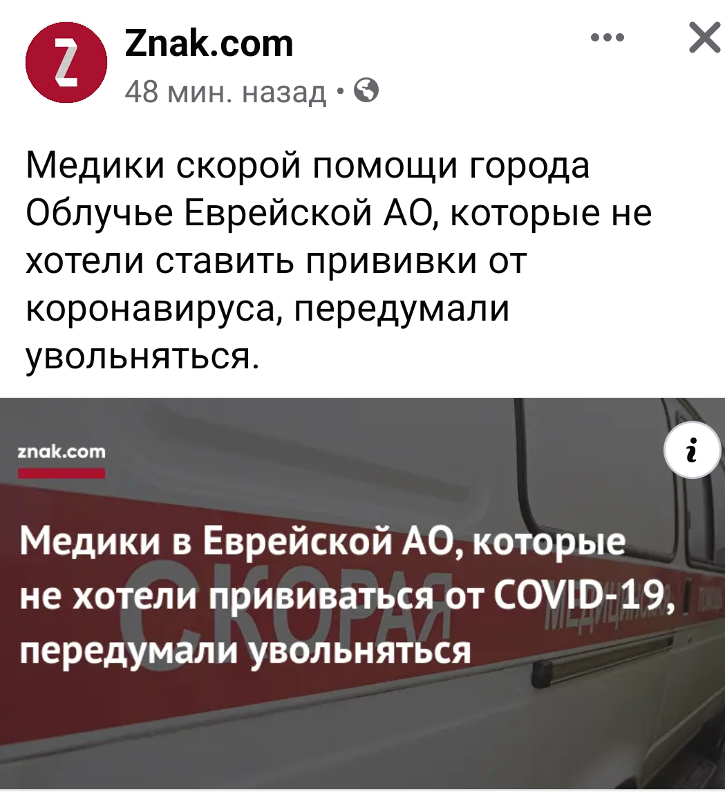 Как сообщалось ранее, в четверг СМИ сообщили о том, что все 15 сотрудников "скорой помощи" города Облучье написали заявления на увольнение из-за нежелания вакцинироваться против коронавируса. Они продолжат работать до 15 ноября. В пятницу стало известно об увольнении ещё 12 сотрудников "скорой помощи" села Пашково Облученского района ЕАО по той же причине.