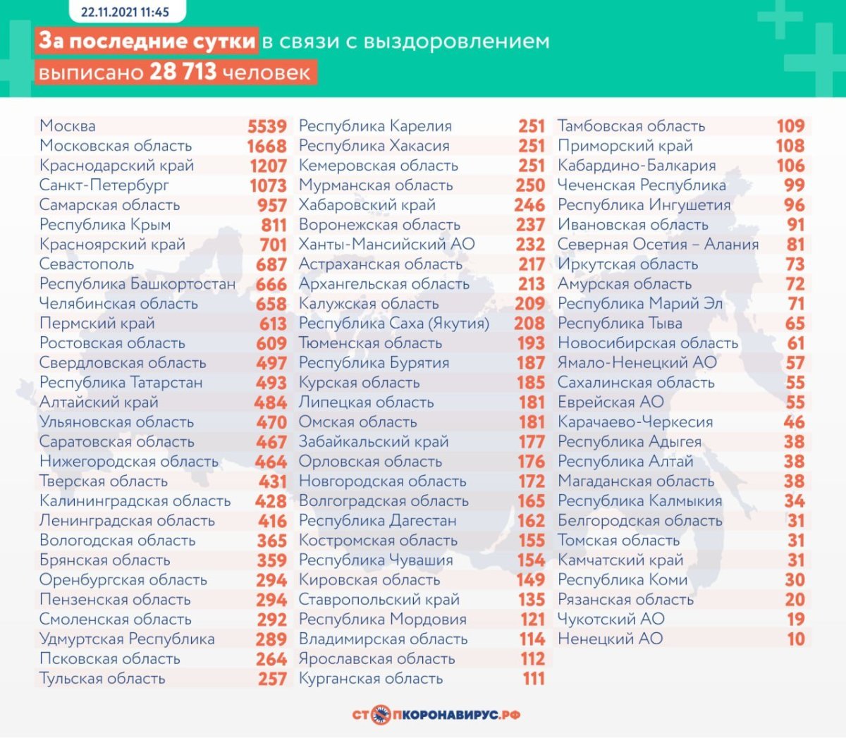 За последние сутки в России в связи с выздоровлением от коронавирусной инфекции выписано 28 713 человек❗