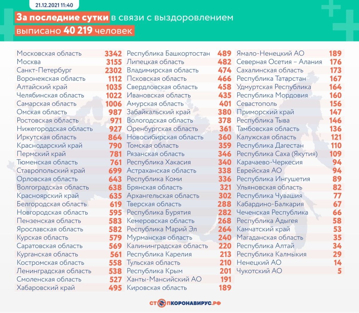 За последние сутки в России в связи с выздоровлением от коронавирусной инфекции выписано 40 219 человек❗