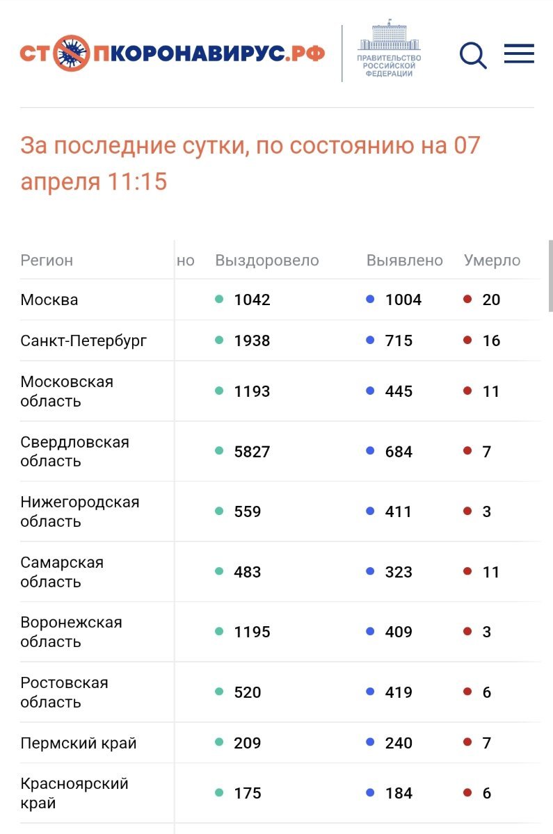 ? выписано в связи с выздоровлением 35 306 человек, на 5,7% меньше по сравнению с 5 апреля