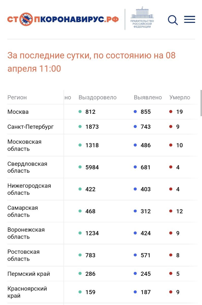 ? выписано в связи с выздоровлением 37 684 человека, на 6,7% больше по сравнению с 7 апреля