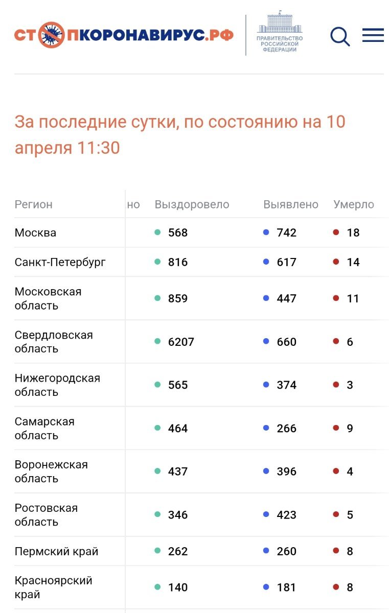 По состоянию на 10 апреля 2022 года в России за сутки: