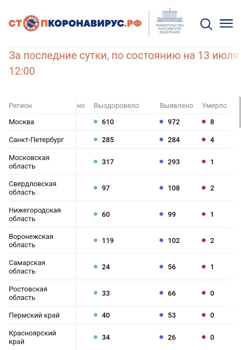 По состоянию на 13 июля 2022 года в России за сутки: