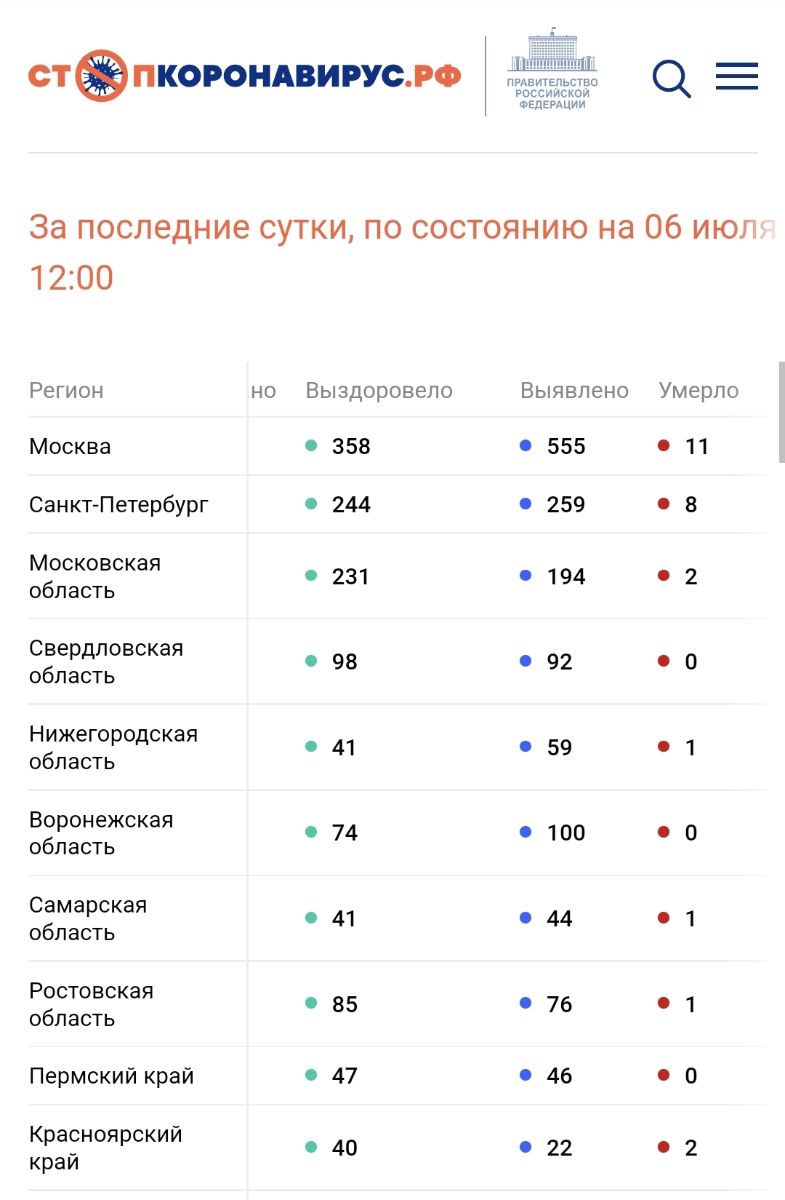 По состоянию на 6 июля 2022 года в России за сутки: