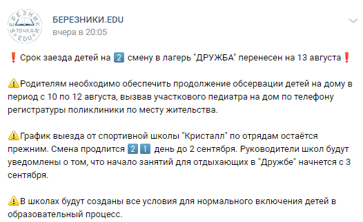 Maria Grigoreva Опубликовано 10 августа, 2020 Опубликовано 10 августа, 2020 37 минут назад, Лерика" сказал(а) : там за вожатых разговоры, туманные, в группе ВК мамочка одного пионера, жалуется, что дитё, после первой смены не берут на площадку при школе, по указанию КВО. Подтёрли это сообщение..