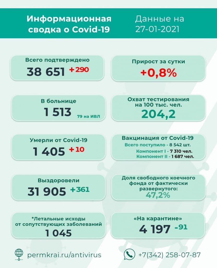 natka Опубликовано 26 января, 2021 Опубликовано 26 января, 2021 (изменено) В Пермском крае выявлено 292 новых случая заражения COVID-19: 67 человек проходят лечение в больницах, 225 – амбулаторно на дому под наблюдением врачей. В числе 292 новых инфицированных 113 пациентов мужского пола, 179 – женского, среди заболевших 12 детей. Из взрослого населения: от 15 до 29 лет – 23 человека, от 30 до 49 лет – 74 человека, 108 в возрасте 50-64 и 75 человек старше 65 лет. Изменено 26 января, 2021 пользователем natka