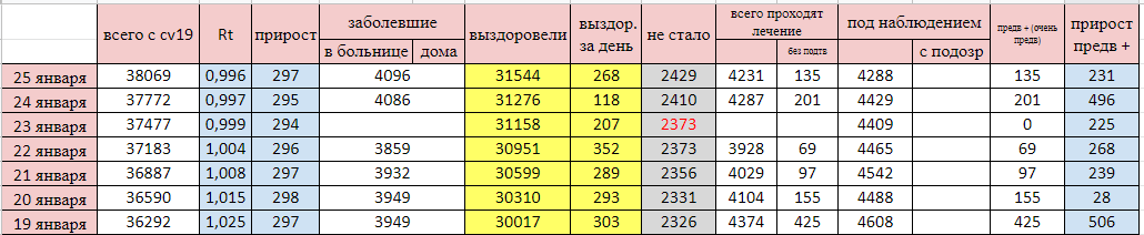 natka Опубликовано 26 января, 2021 Опубликовано 26 января, 2021 КОРОНАВИРУС | ПЕРМСКИЙ КРАЙ | ОФИЦИАЛЬНАЯ ИНФОРМАЦИЯ В Пермском крае на 10 часов утра 26 января за последние сутки: Всего 38 069 подтверждённых случаев заболевания коронавирусной инфекцией, 31 544 человека выздоровели, 4 288 человек изолированы на дому по предписанию главного санитарного врача. За сутки в лабораториях Пермского края проведено 2 473 исследования на коронавирусную инфекцию. Всего проходит лечение 4 231 человек (4 096 человек с коронавирусом, а также 135 пациентов с ОРВИ, пневмонией, по ним ожидается подтверждение на COVID-19). решила ничего не исправлять, потому что достоверной информации нет