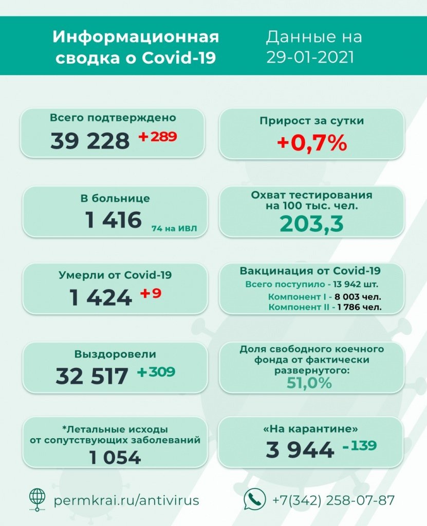 natka Опубликовано 29 января, 2021 Опубликовано 29 января, 2021 (изменено) В Пермском крае выявлено 289 новых случаев заражения COVID-19: 55 человек проходят лечение в больницах, 234 – амбулаторно на дому под наблюдением врачей. В числе 289 новых инфицированных 119 пациентов мужского пола, 170 – женского, среди заболевших 18 детей. Из взрослого населения: от 15 до 29 лет – 26 человек, от 30 до 49 лет – 83 человека, 82 в возрасте 50-64 и 80 человек старше 65 лет Изменено 29 января, 2021 пользователем natka