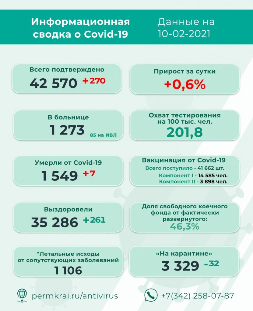 natka Опубликовано 10 февраля, 2021 Опубликовано 10 февраля, 2021 В Пермском крае выявлено 270 новых случаев заражения COVID-19: 55 человек проходят лечение в больницах, 215 – амбулаторно на дому под наблюдением врачей. В числе 270 новых инфицированных 98 пациентов мужского пола, 172 – женского, среди заболевших 22 ребенка. Из взрослого населения: от 15 до 29 лет – 25 человек, от 30 до 49 лет – 58 человек, 94 в возрасте 50-64 и 71 человек старше 65 лет.