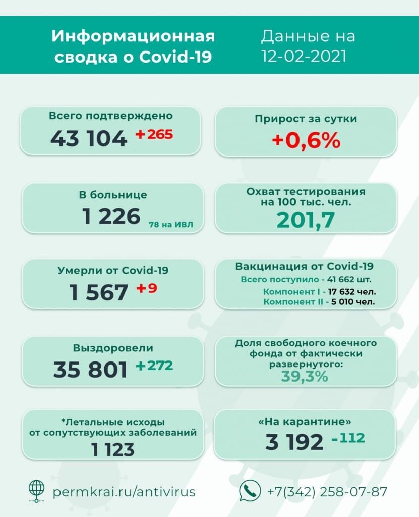 natka Опубликовано 12 февраля, 2021 Опубликовано 12 февраля, 2021 КОРОНАВИРУС | ПЕРМСКИЙ КРАЙ | ОФИЦИАЛЬНАЯ ИНФОРМАЦИЯ В Пермском крае на 10 часов утра 12 февраля за последние сутки: Всего 42 839 подтверждённых случаев заболевания коронавирусной инфекцией, 35 801 человек выздоровел, 3 192 человека изолированы на дому по предписанию главного санитарного врача. За сутки в лабораториях Пермского края проведено 6 767 исследований на коронавирусную инфекцию. Всего проходят лечение 4 399 человек (4 348 человек с коронавирусом, а также 51 пациент с ОРВИ, пневмонией, по ним ожидается подтверждение на COVID-19).