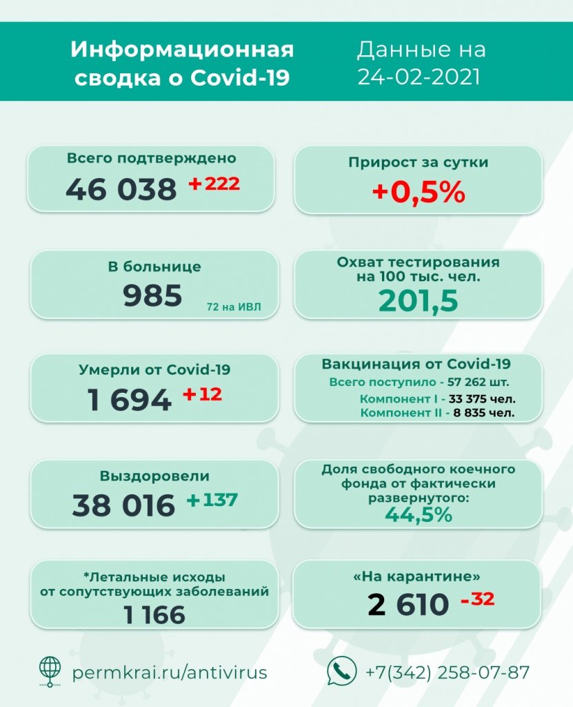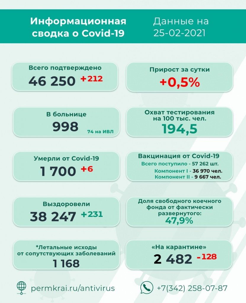 natka Опубликовано 25 февраля, 2021 Опубликовано 25 февраля, 2021 КОРОНАВИРУС | ПЕРМСКИЙ КРАЙ | ОФИЦИАЛЬНАЯ ИНФОРМАЦИЯ В Пермском крае на 10 часов утра 25 февраля за последние сутки: Всего 46 038 подтверждённых случаев заболевания коронавирусной инфекцией, 38 247 человек выздоровели, 2 482 человека изолированы на дому по предписанию главного санитарного врача. За сутки в лабораториях Пермского края проведено 3623 исследования на коронавирусную инфекцию. Всего проходит лечение 4 934 человека (4 923 человека с коронавирусом, а также 11 пациента с ОРВИ, пневмонией, по ним ожидается подтверждение на COVID-19). По состоянию на 25 февраля в "Краевой больнице им.Вагнера Е.А." лечение с подтверждённым диагнозом – коронавирусная инфекция – проходят 40 (-3) человек. По предписанию Роспотребнадзора 224 (-1) человека с подтверждённым диагнозом - COVID-19 изолированы и проходят лечение на дому. На «карантине» по предписанию Роспотребнадзора в Березниках находятся 411 (-3) человек.