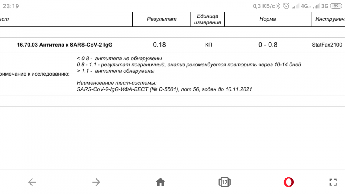 jimm031 Опубликовано 7 марта, 2021 Опубликовано 7 марта, 2021 30 минут назад, T@tyana сказал(а) : А до того, как - сколько было? Вот у меня за два дня до V1. Это другой IgG, на нуклеокапсидный белок. Он бывает положительным только после ковида. З.Ы. Кстати, тут недавно оказалось, что у самого производителя этого теста есть серая зона(сомнительный результат) от 0.49 до 1.4. 34 минуты назад, T@tyana сказал(а) : У меня 0,18 А можно скрин или фото результата с описанием системы(как у меня), без личных данных конечно же.