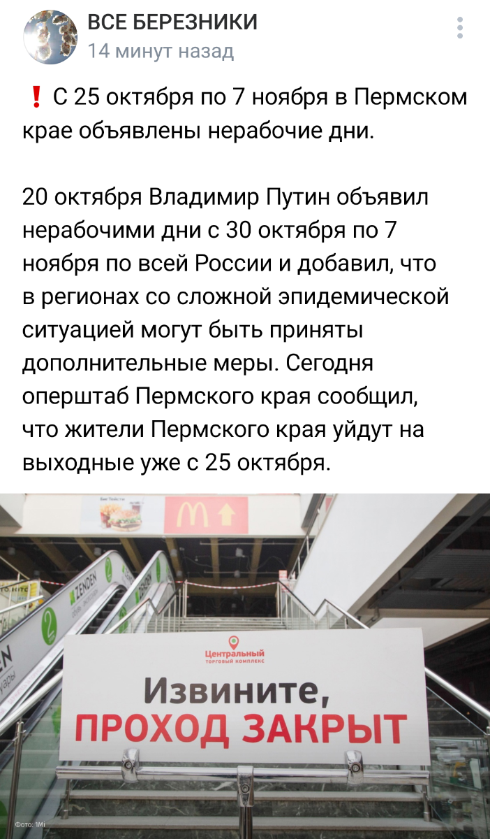RomanIzrailevich Опубликовано 22 октября, 2021 Опубликовано 22 октября, 2021 Пермский край вводит нерабочие дни с 25 октября по 7 ноября. Об этом в пятницу, 22 октября, сообщила заместитель руководителя администрации губернатора Мария Геворгян. «С 25 октября по 7 ноября в Пермском крае устанавливаются нерабочие дни», — заявила она журналистам. Первая часть нерабочих дней в период с 25 по 29 октября вводится на основе указа губернатора, вторая — на основании указа президента РФ Владимира Путина. Кроме того, оперштаб ввел в Пермском крае с 25 октября QR-коды для посещения ТЦ, ресторанов, кафе. Известия