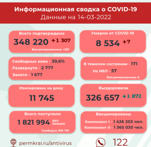 natka Опубликовано 14 марта, 2022 Опубликовано 14 марта, 2022 По состоянию на 14 марта в "Краевой больнице им.Вагнера Е.А." в инфекционном отделении на лечении находятся 53(-10 к 11 марта) человека, из них с подтверждённым диагнозом – коронавирусная инфекция – 28(-5) пациентов. По предписанию Роспотребнадзора 51(-6) человек с подтверждённым диагнозом - COVID-19 изолированы и проходят лечение на дому. v1 +36 в тяжёлом +2 ивл -7 занято -97 ошиблась на 8, понижение Rt