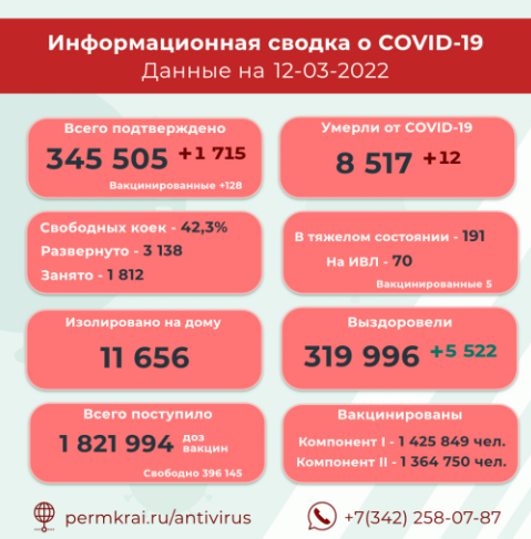 jimm031 Опубликовано 17 марта, 2022 Опубликовано 17 марта, 2022 Статистика по Соликамскому городскому округу на 17 марта 2022 года. Заболевших за сутки: 3 человека. В инфекционном отделении ГБУЗ ПК «ГБ г. Соликамск» проходят лечение 82 пациента. С диагнозом «коронавирусная инфекция» - 49 человек, 41 из них – жители Соликамского городского округа. На лечении амбулаторно с легкой формой заболевания находится 81 человек. За весь период пандемии поправилось 12 211 человек; умерло от подтвержденного диагноза «коронавирусная инфекция» 196 человек (не привиты). https://vk.com/gbsolikamsk?w=wall-188407091_4046 12 529 выявлено